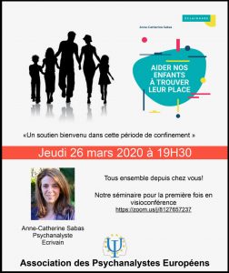 Face à la crise sanitaire que nous traversons, l’Association des Psychanalystes Européens ( A.P.E. ) vous invite à un webinaire, le Jeudi 26 mars à 19h30. Pour participer, très simple : connectez-vous 5 minutes avant le début, à partir du lien indiqué sur l’affiche : https://zoom.us/j/8127657237